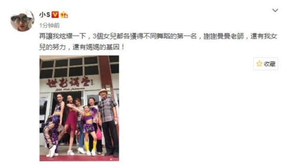 在6月30日,小S在网上激动的晒出了自己一家人的合照,而且表示三个女儿均获得舞蹈比赛的第一名,言辞十分的真切,而且还向老师们表达了自己的感谢,最后还不忘自夸一波,表示女儿们继承了自己的好基因,不禁令人忍俊不禁。