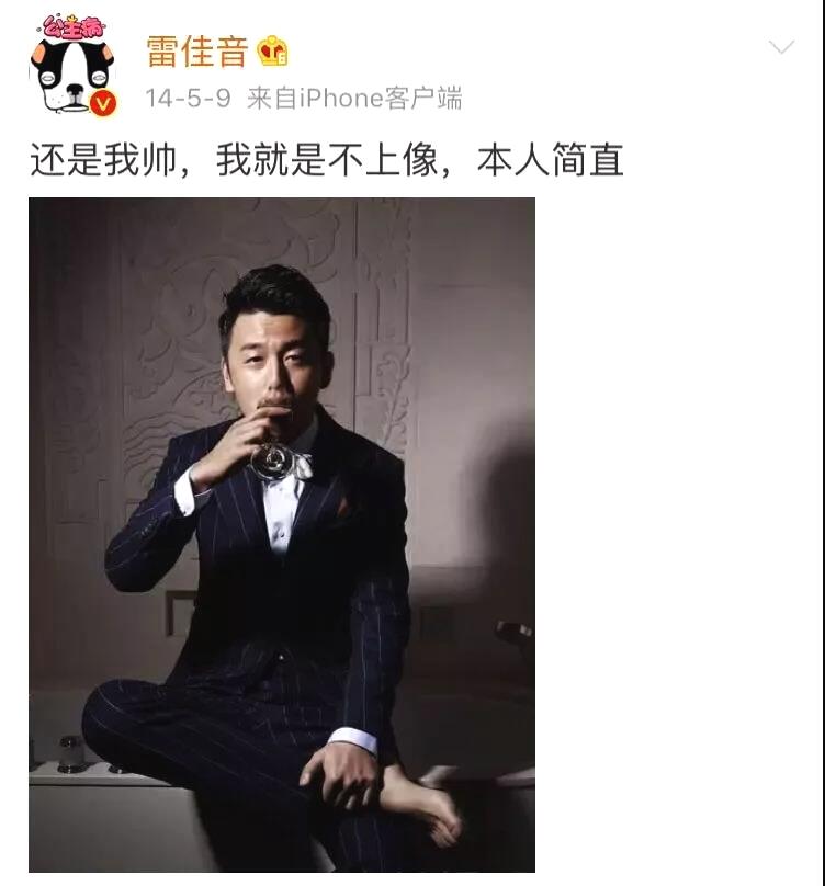 现在的艺人没有个人设都不敢说自己红,当其他人在走清新小奶狗、雅痞大叔风的人设时,雷佳音开启了一股狂吹自己彩虹屁的俗风。