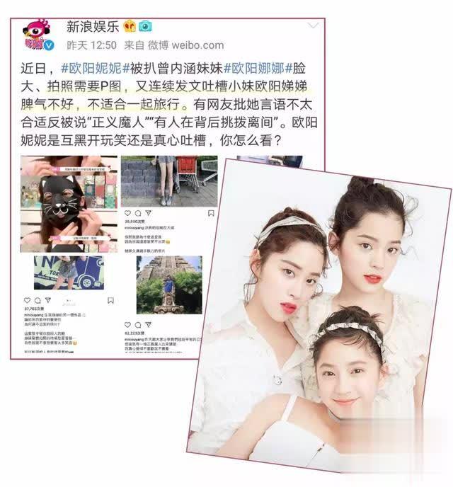 还有近期被网友热议的“欧阳妮妮暗讽亲妹”事件。有人说是姐妹间的调侃不必上纲上线,有人认为是小女生嫉妒心作怪。