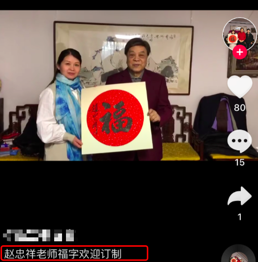 赵忠祥不只主持功底深厚,在书画领域也很有造诣。近日,有网友在社交平台晒出一段赵忠祥的视频,配文称:“赵忠祥老师福字欢迎定制”。视频中,赵忠祥笑容和煦,与粉丝各拿书法作品的一侧亲切合影。该网友表示购买价格私聊,能免费合影,而且还能去赵忠祥家参观。之前某综艺节目中曝光了赵忠祥的居所内部,在书房一角的小方几上贴了一张收款码。据悉,不仅售卖书画作品,赵忠祥还能代录祝福语、吉祥话甚至微商广告。
