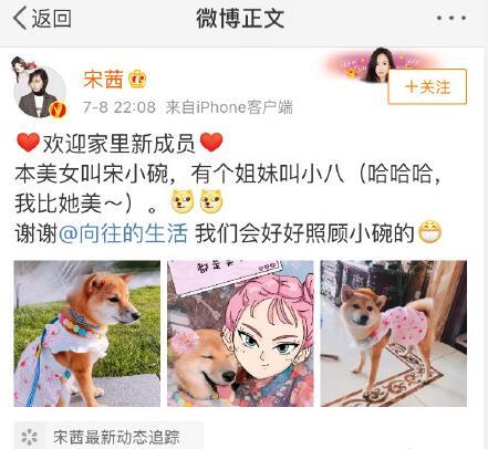 碗妹的新主人是宋茜,7月8日宋茜发博欢迎小碗加入大家庭,并表示它还有个姐妹叫小八,从照片来看,碗妹被宋茜打扮得很少女,看来碗妹这是要开始过精致生活了,相信宋茜会好好照顾小碗。