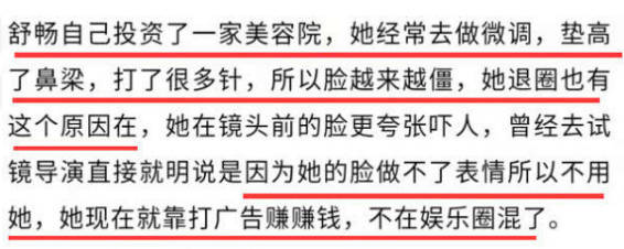 知情人士还透露,没戏可拍的舒畅自己投资了一家美容院,经常去做微调,鼻梁垫高了,也打了很多针,导致五官和脸蛋变得越来越僵硬。