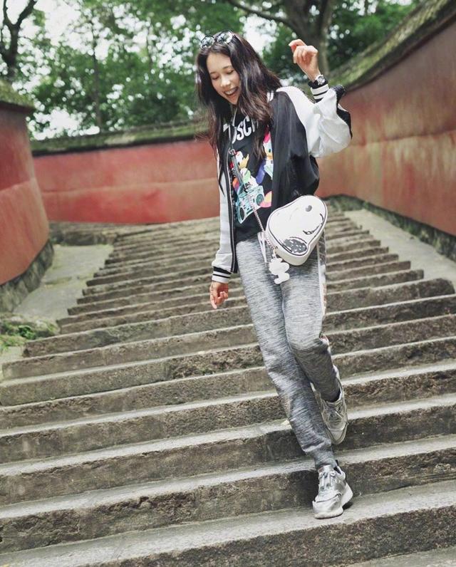 这一套穿搭则是运动风格,上身是一件黑色的T恤加一件黑白色的运动外套,下身是灰色的运动长裤以及一双普通的运动鞋,整体非常休闲随意。再背着一个白色的史努比包包,让休闲活泼中又多了一丝可爱。莫文蔚还将墨镜放在头上,这样不仅可以将碎发束起来,同时也可让造型显得更加的时髦。这样的穿搭非常适合女生出去游玩,非常的休闲舒适又不失时尚感。