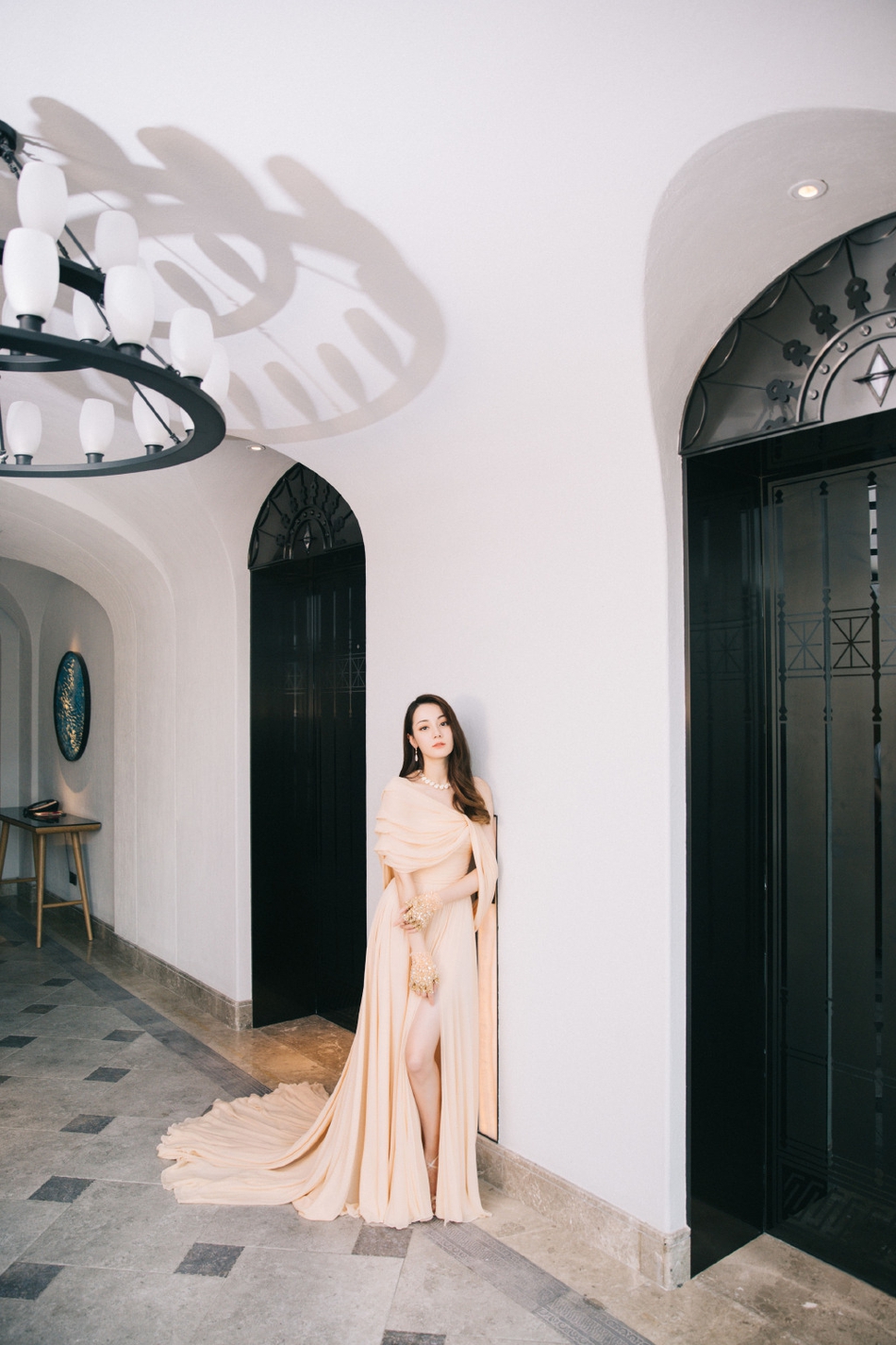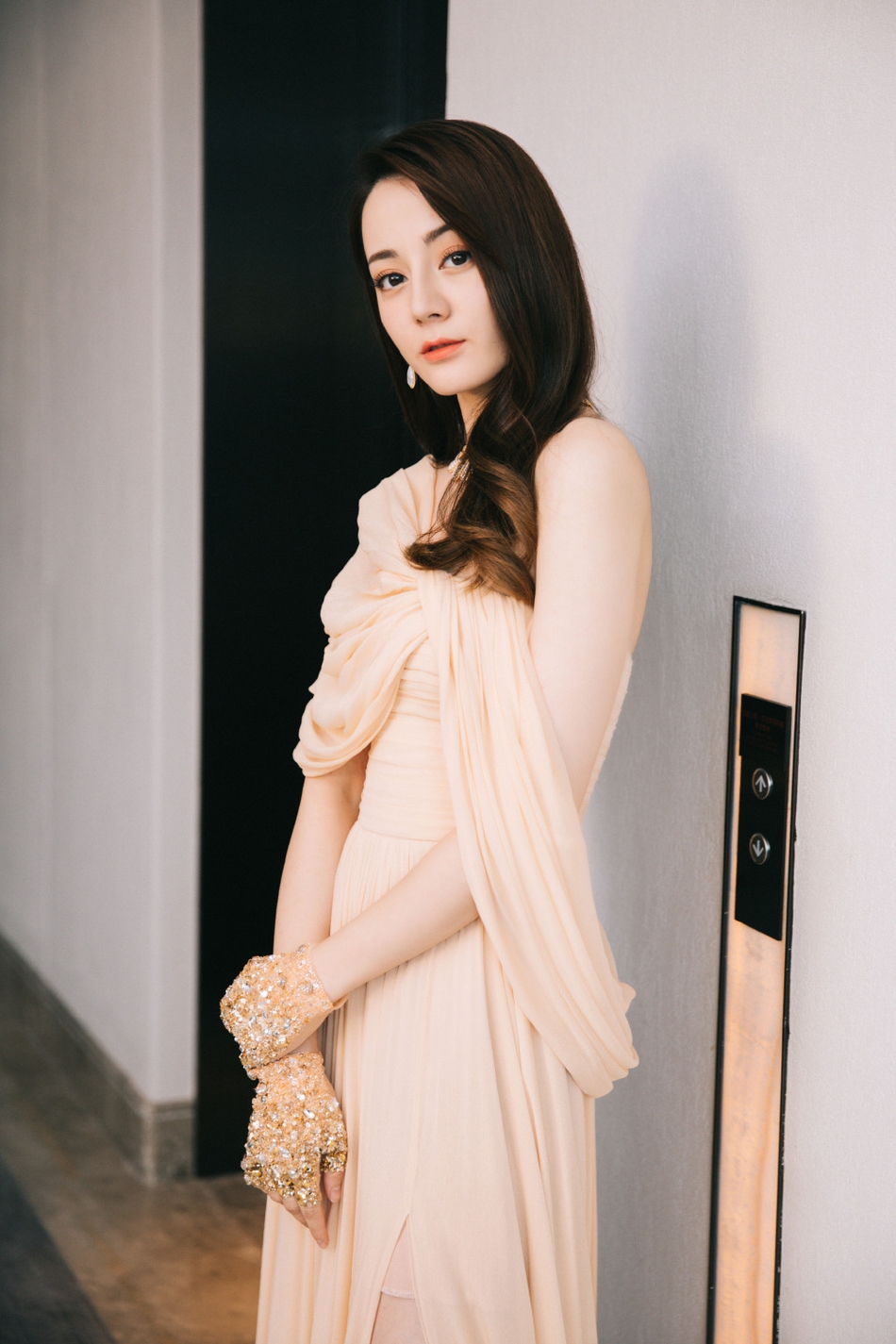 迪丽热巴裸色薄纱礼服飘仙气 香肩嫩滑迷人
