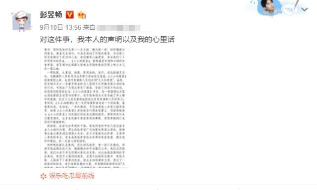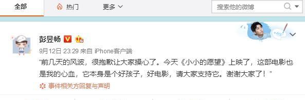 今天,彭昱畅在自己的社交网站上突然发文写道:前几天的风波给大家道歉了,让大家操心了。他是我们的共同心血,就像是我们的孩子一样,今天他上映了,希望大家一起去支持他。