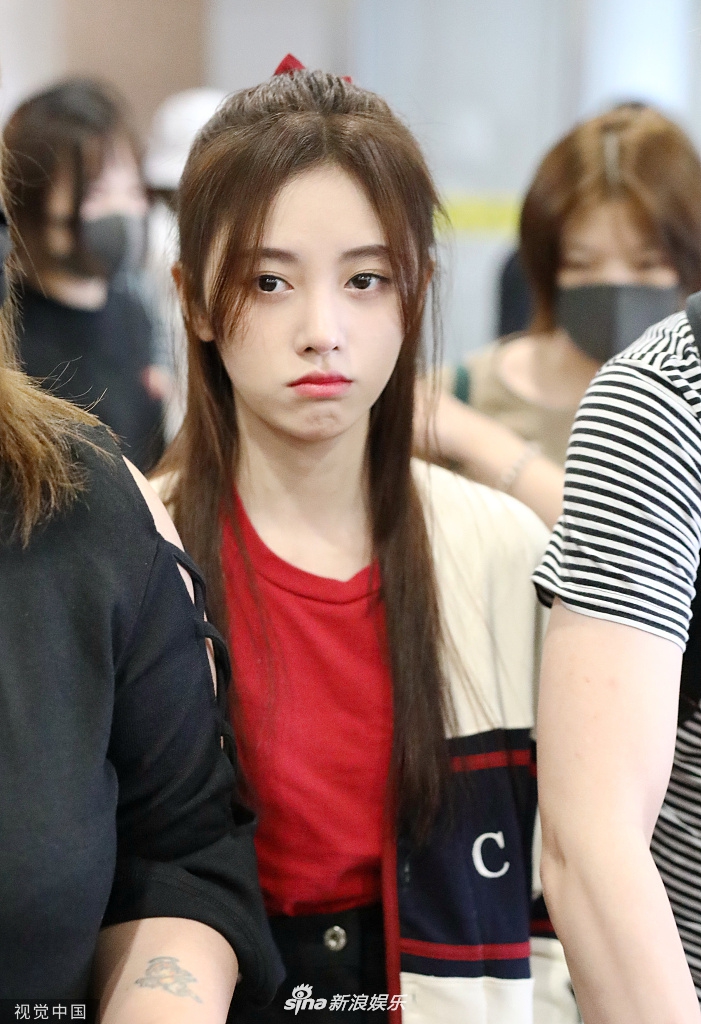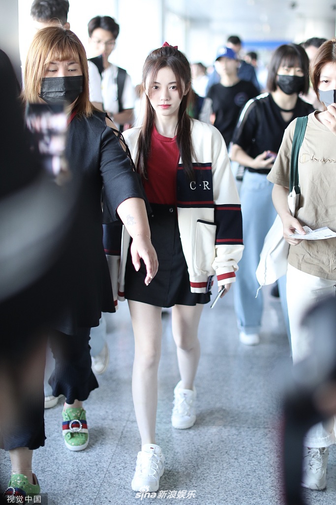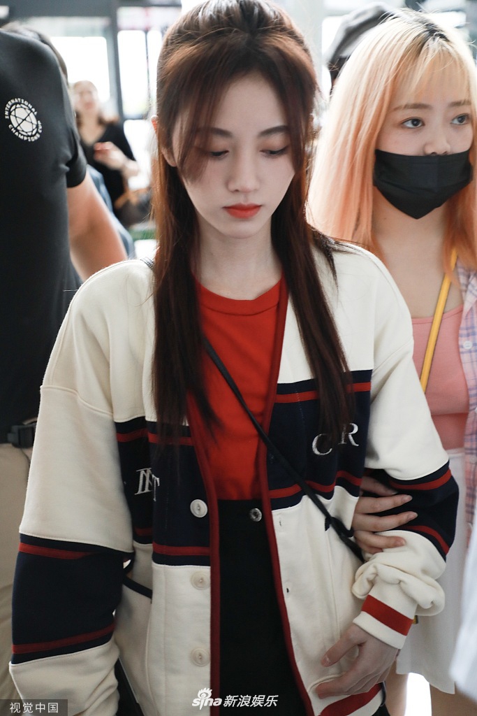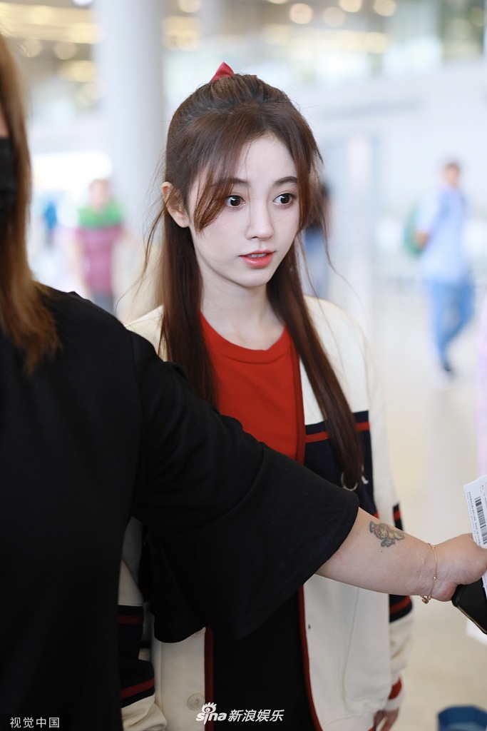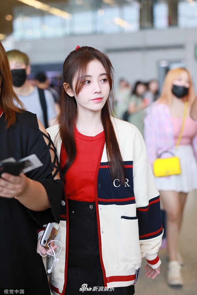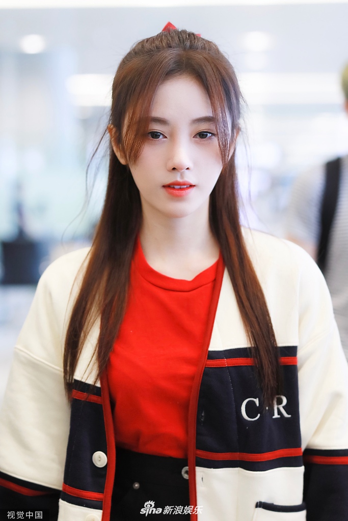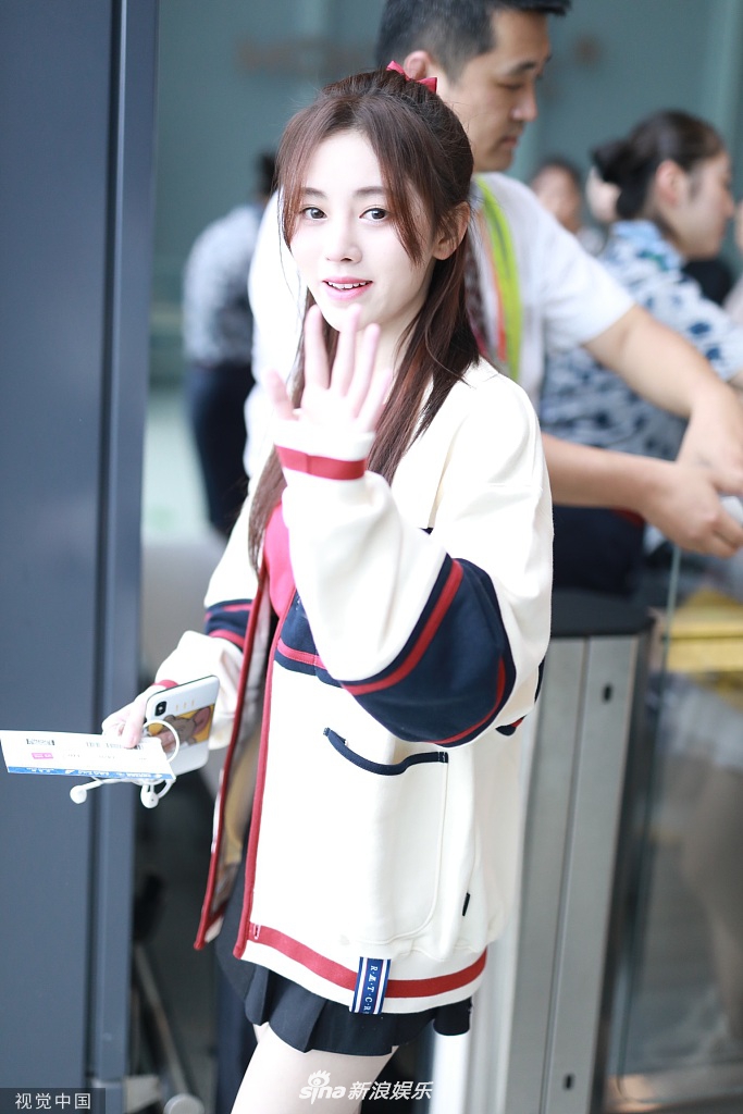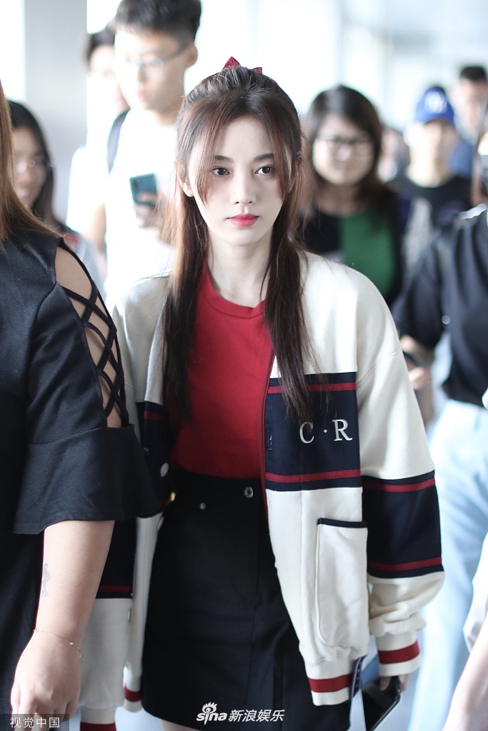 鞠婧祎头戴红色蝴蝶结清纯可爱 接受安检表情呆萌惹人爱