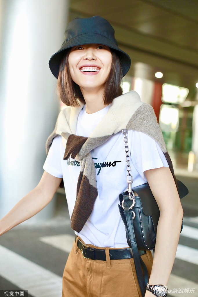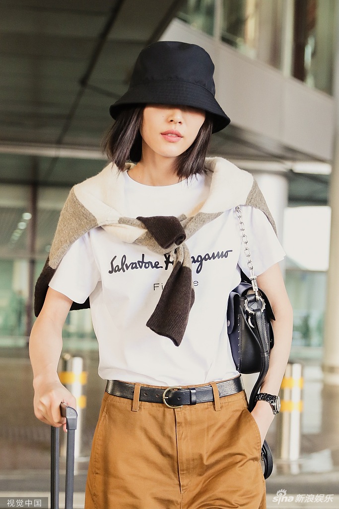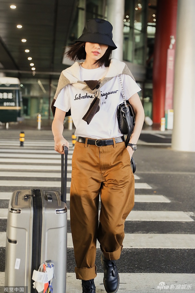 日前,刘雯亮相机场,她身穿白色T恤和深咖色长裤完美示范秋日酷女孩穿搭,戴渔夫帽,将毛衣搭肩既文艺又知性,面对镜头露出甜笑,心情不错。