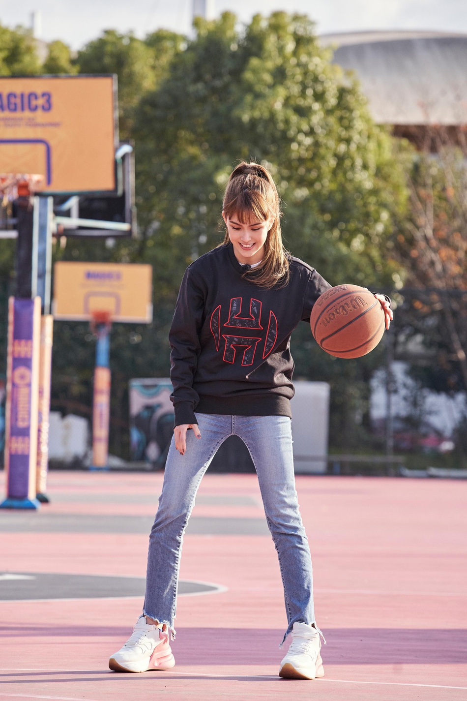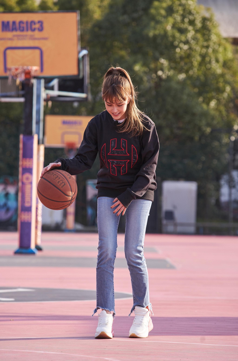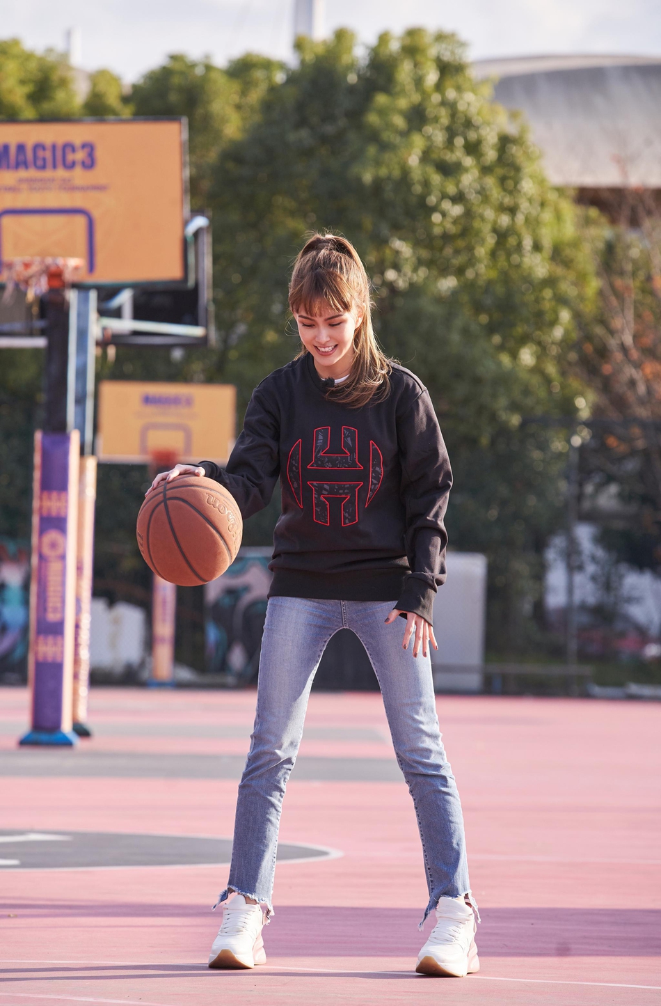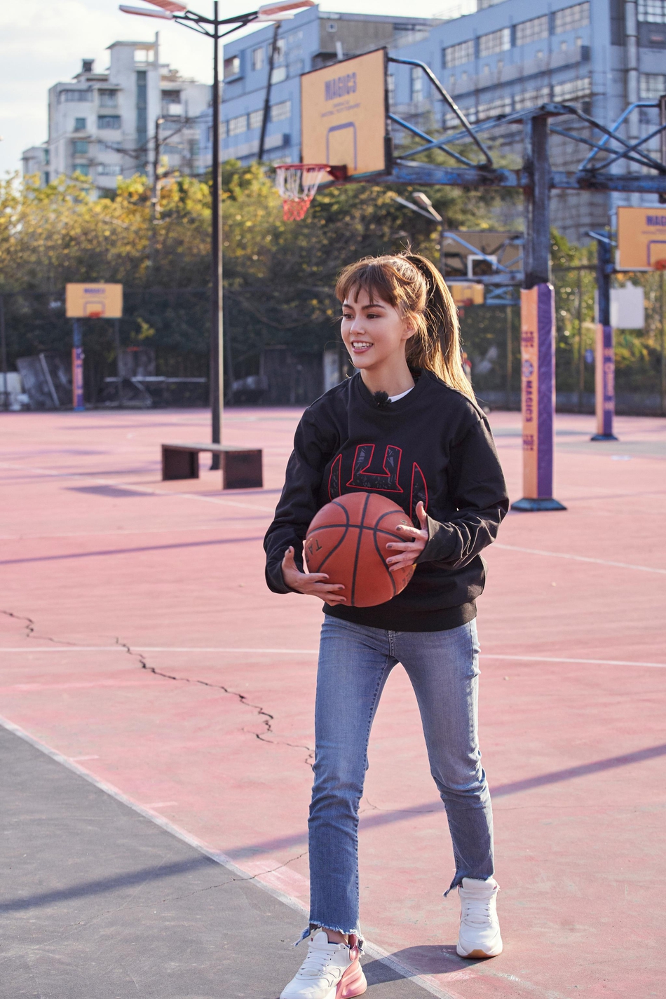 昆凌投篮姿势标准动作干净利落 头扎高马尾造型青春带酷