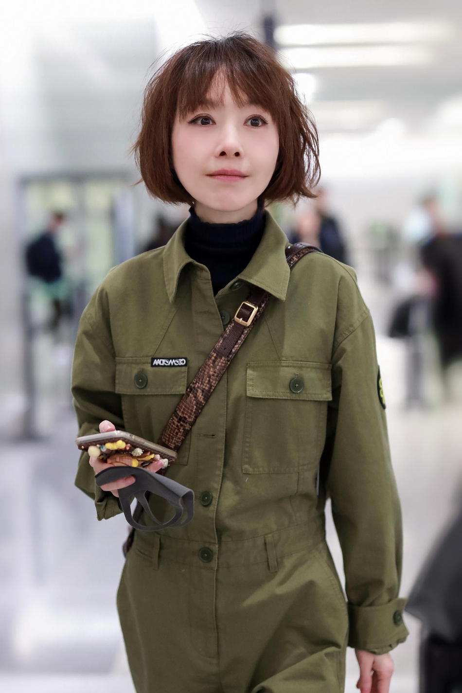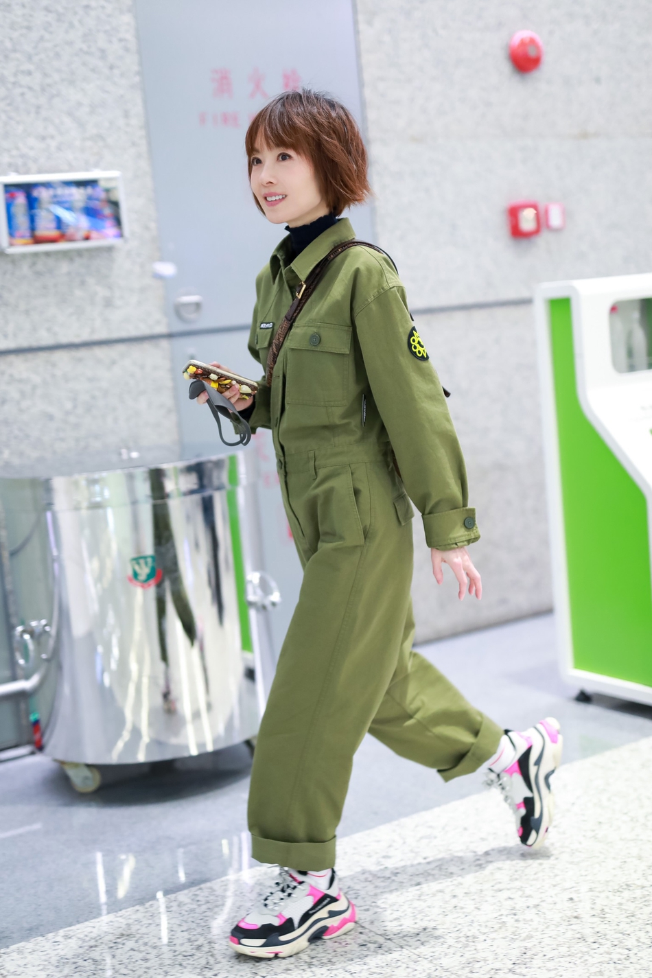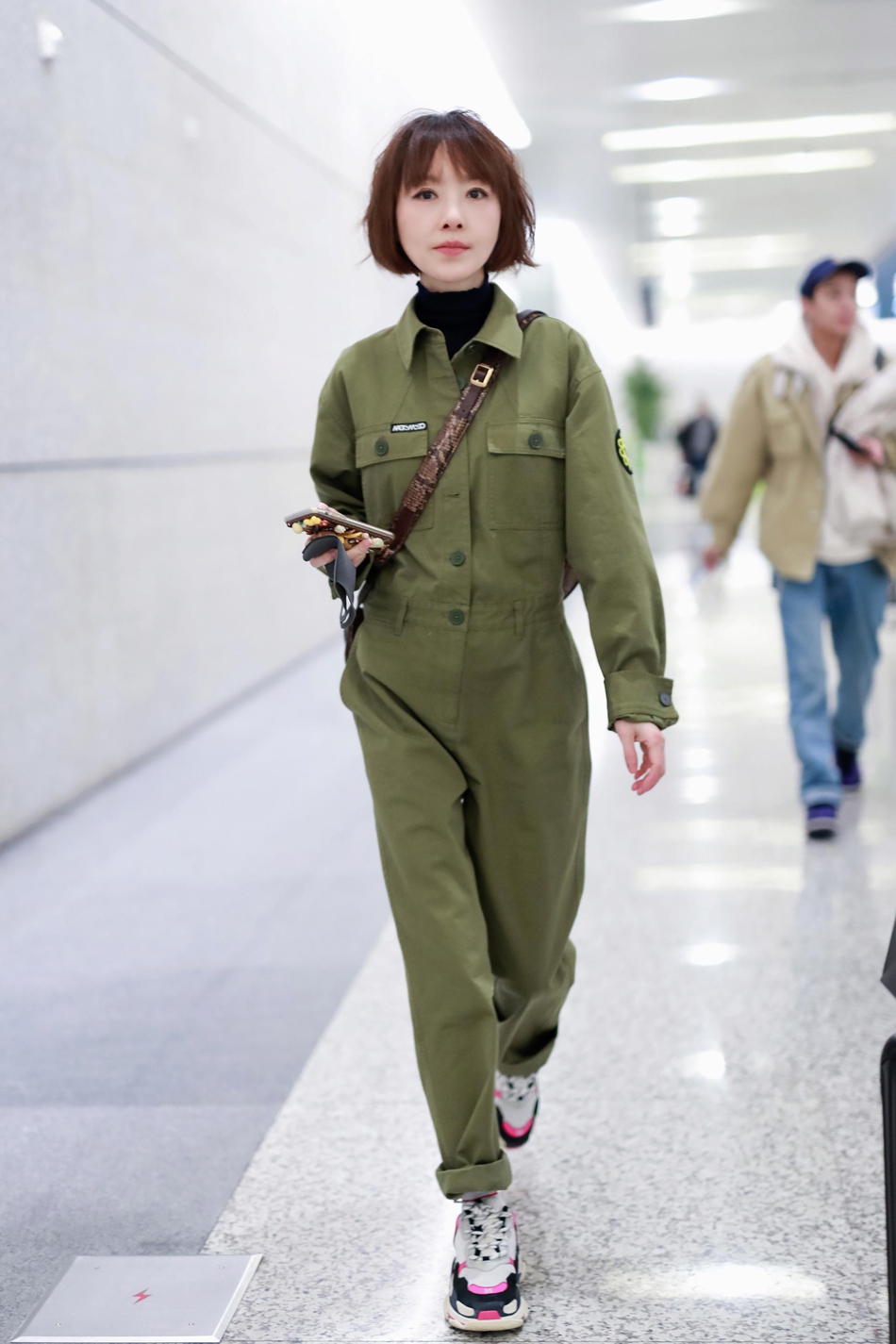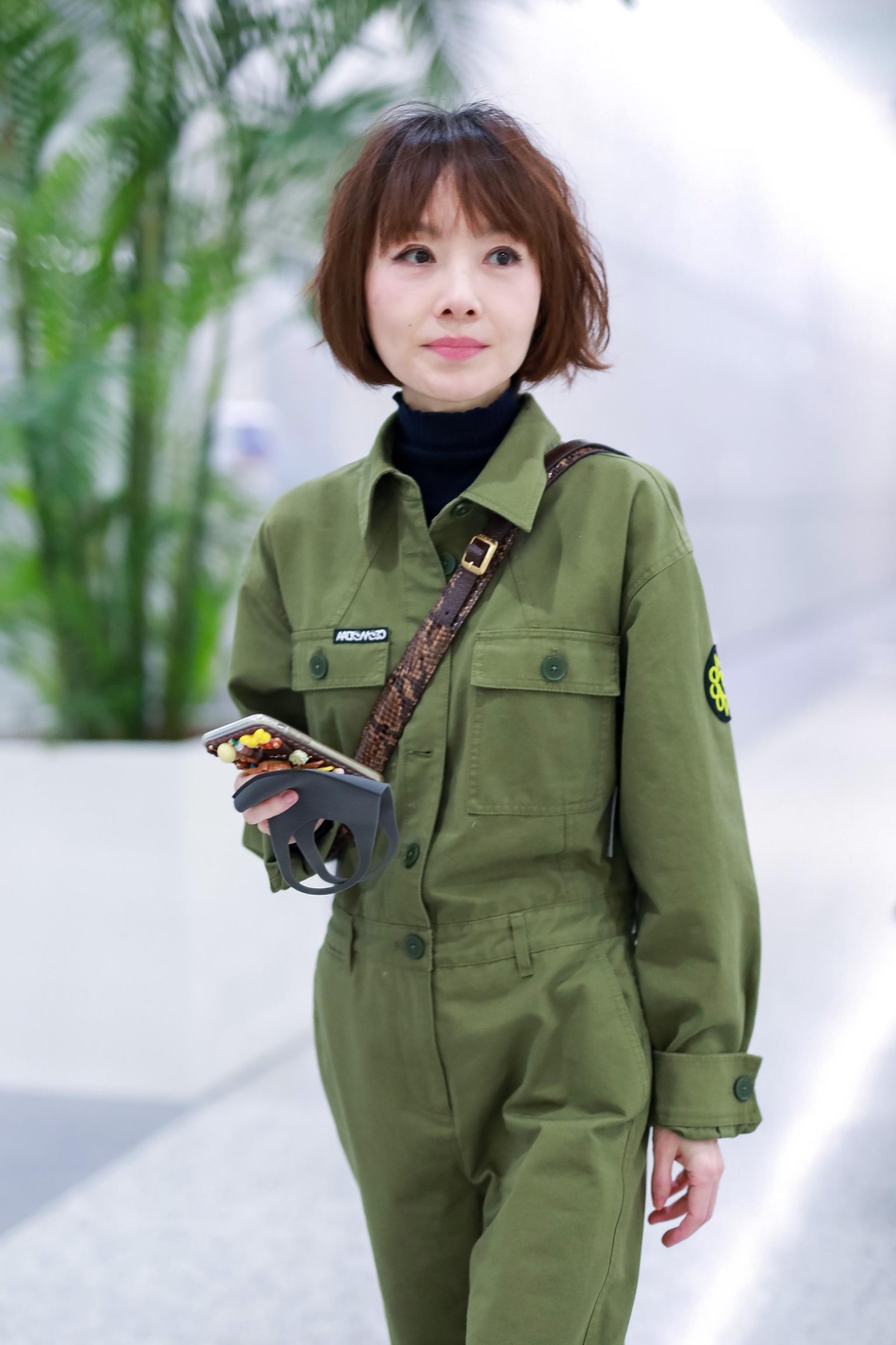 17日,鲁豫现身机场,身穿军绿色连体工装裤,搭配运动鞋率性干练,衣品超赞。卡通手机壳精致可爱,尽显童心。