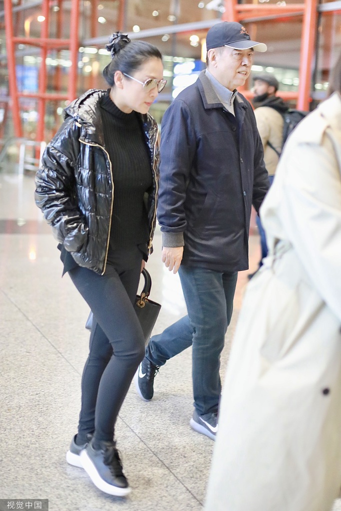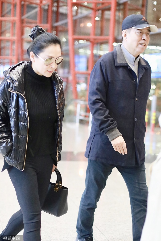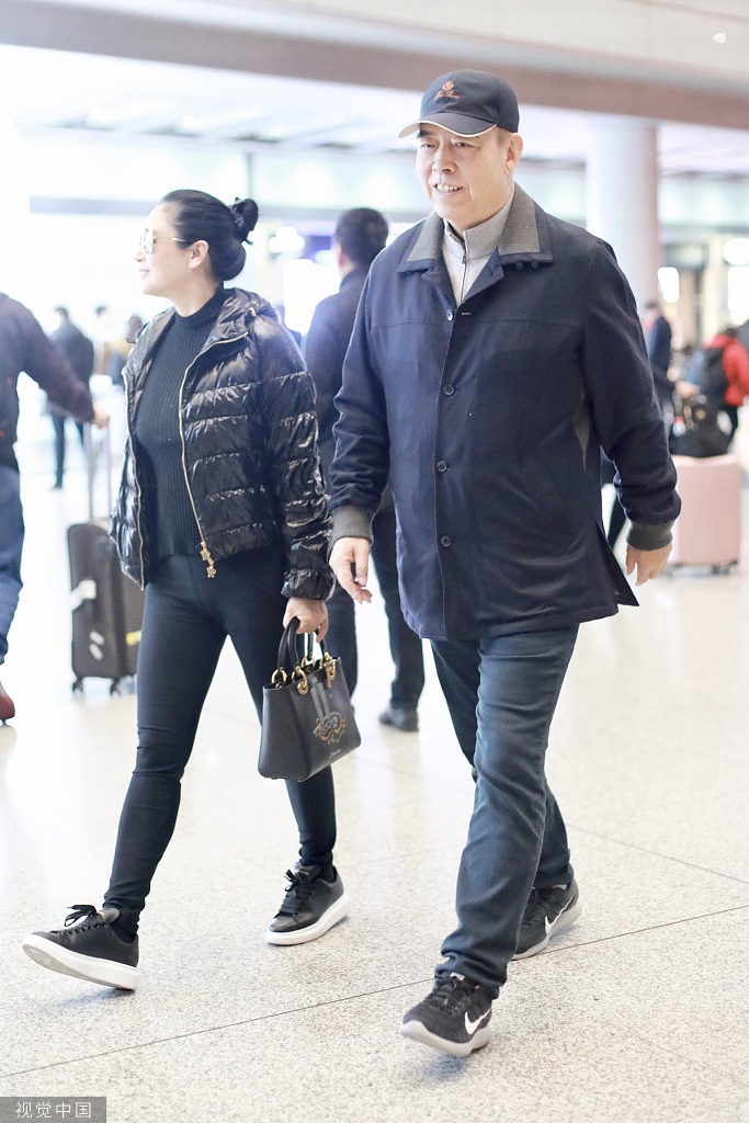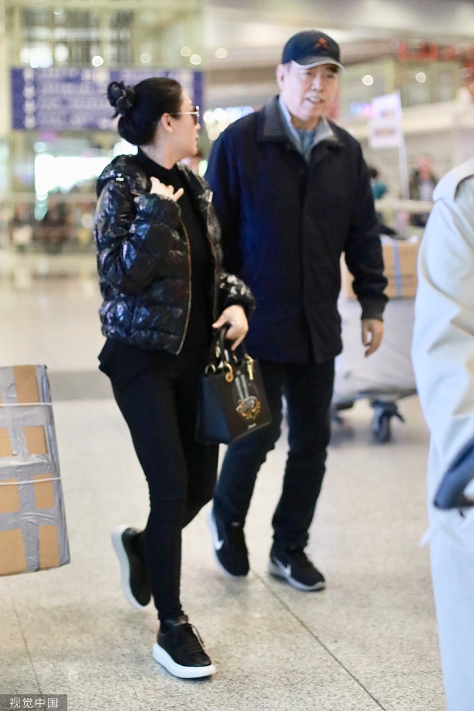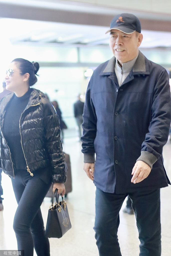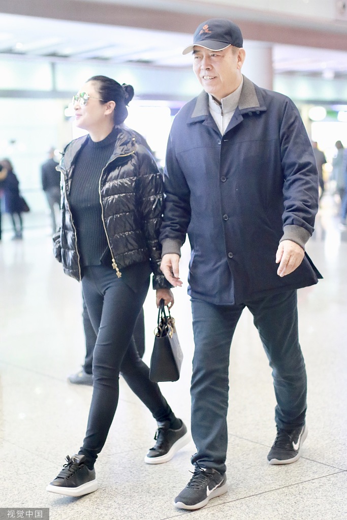 12月6日,陈凯歌与老婆陈红现身北京机场。陈红扎丸子头戴黑超,穿一身黑色休闲装,身材依然能打,一路与朋友热聊。陈凯歌戴棒球帽,推超大行李,紧随老婆身后超呆萌。(视觉中国/图)