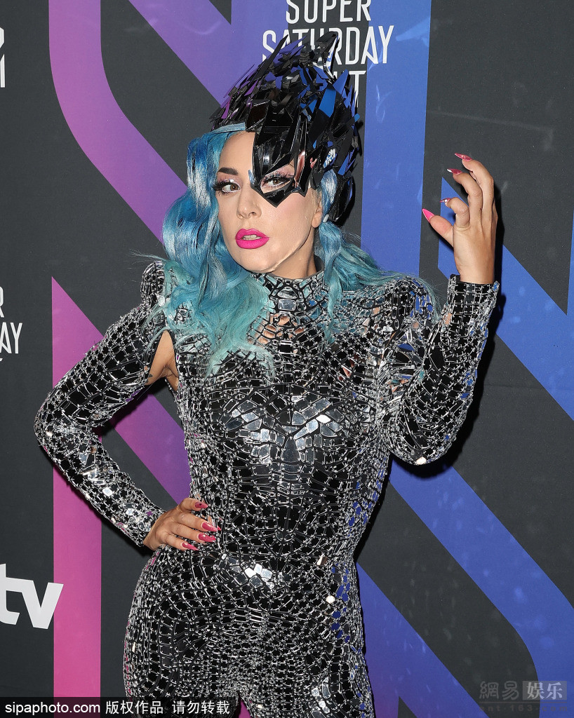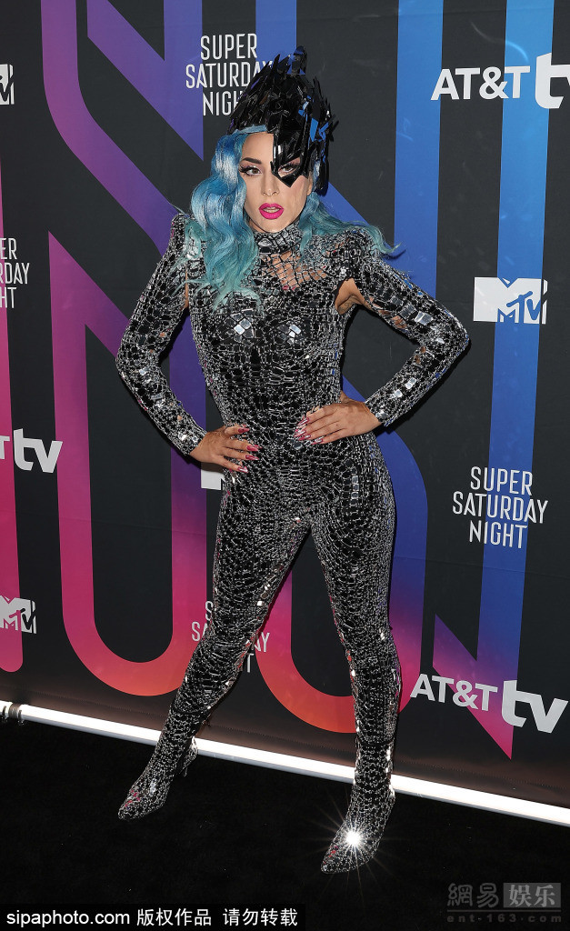LadyGaga穿亮片连体装现身 蓝卷发造型狂野