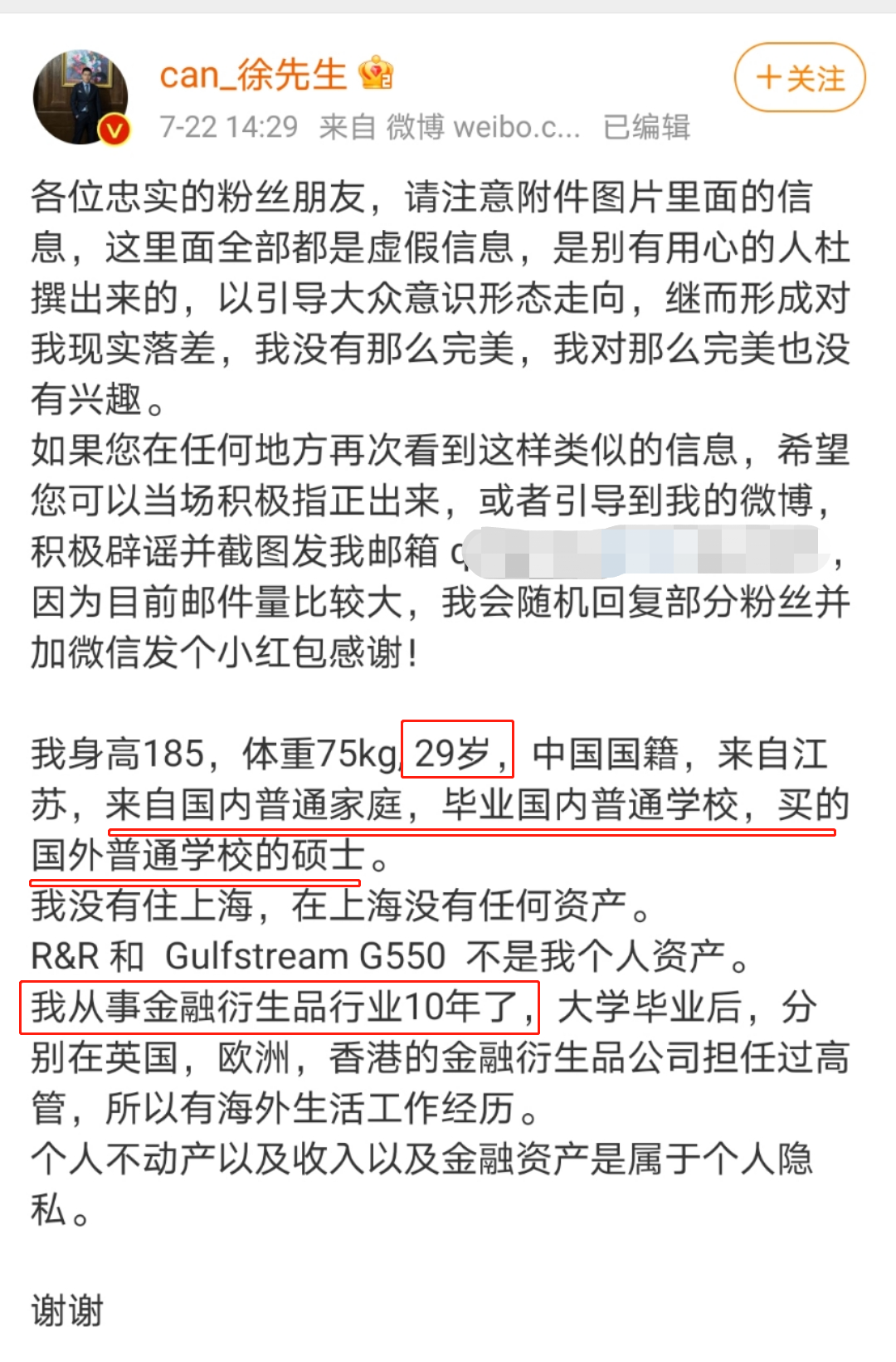 不过,徐勤根曾在微博上否认该传言,并给出一段关于他本人的信息:今年29岁,已从事金融衍生品行业10年,大学毕业后在英国、欧洲的金融衍生品公司担任过高管。