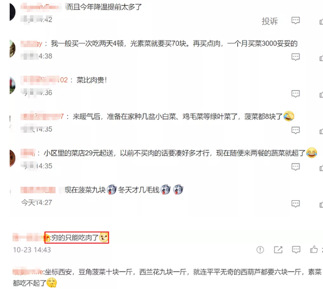 对于蔬菜价格大幅上涨和今年来处于低谷的猪肉价,有网友甚至调侃:穷的只能吃肉了...
