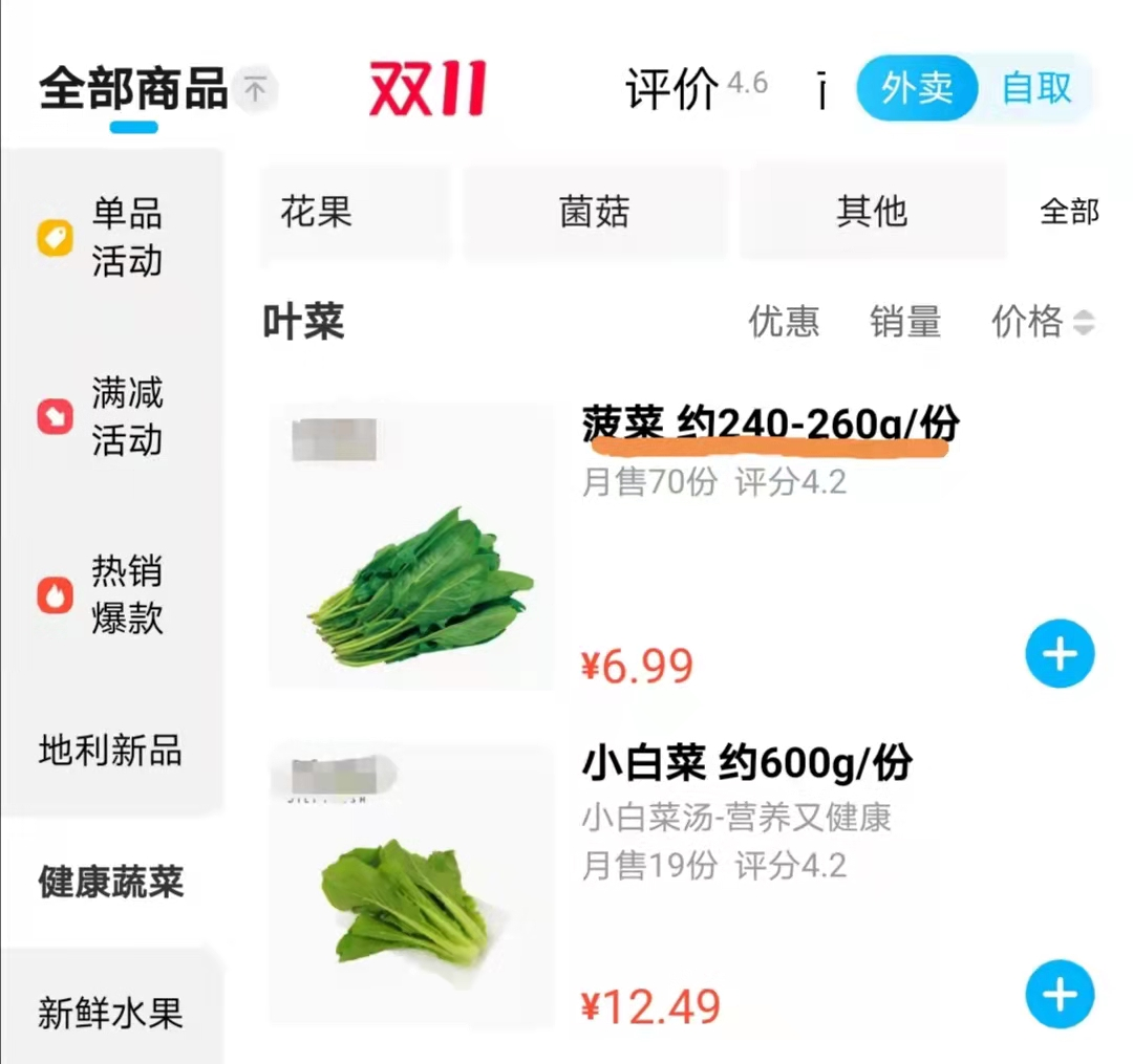 先来看看沈阳的情况,辽婶儿在某外卖平台上看到半斤菠菜的价格高达6.99元,一斤算下来要14元左右,而小白菜的价格也差不多,600g的价格是12.49元。
