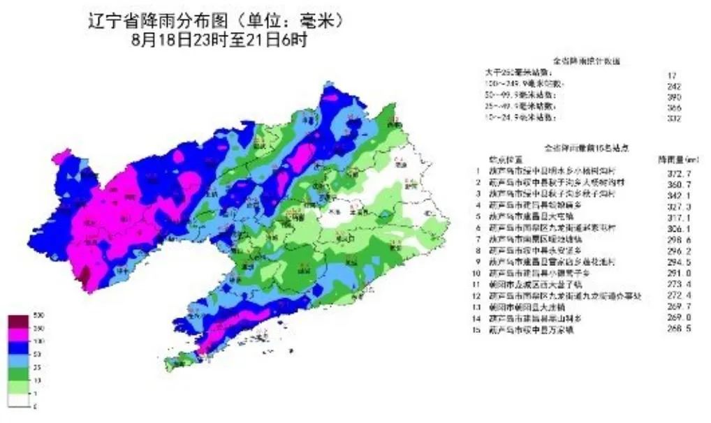 8月18日23时至21日6时,我省西部、南部地区及新民、法库、辽中,昌图出现暴雨到大暴雨,朝阳、葫芦岛地区的部分乡镇出现特大暴雨;其他大部地区出现中雨到大雨。全省大部地区均出现雷电。全省出现828站次的短时强降水。最大整点一小时降雨98.8毫米出现在葫芦岛市绥中县万家镇。