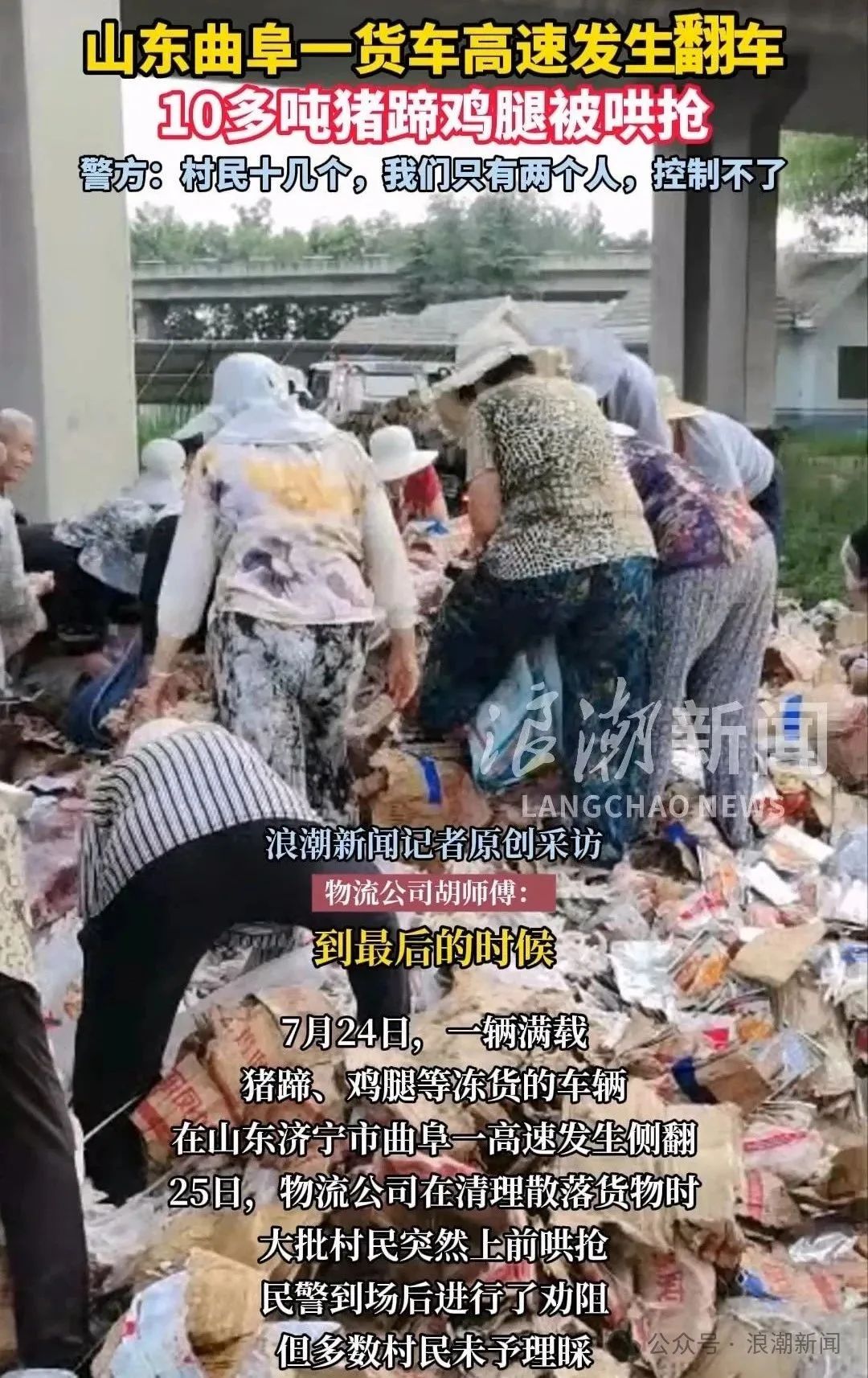 “被抢和糟蹋了10多吨冻品,损失超过40万元,到现在一个人都还没抓到!”7月28日,山东一家物流公司负责人姬先生向浪潮新闻反映,公司一辆货车在山东曲阜发生事故翻车,散落的猪蹄、鸡腿、巧克力等大批冷冻货物被抢。