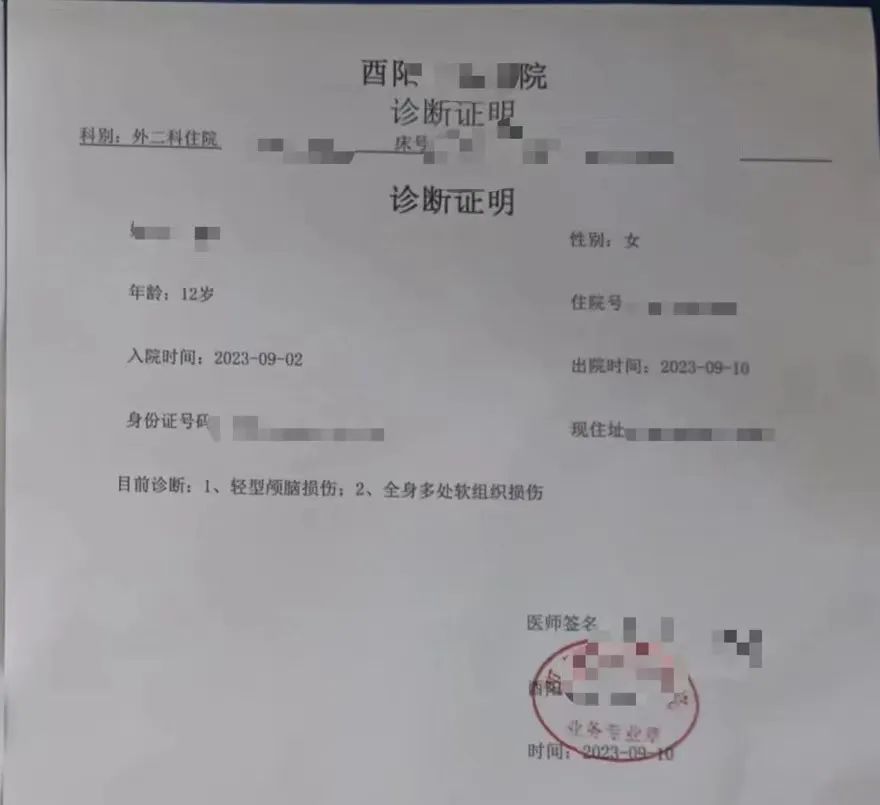 在医院,孙先生的妹妹被诊断为轻型颅脑损伤,全身多处软组织挫伤,于9月2日入院,9月10日出院。孙先生说,自己支付了1000余元医药费后,学校的老师帮忙垫付了剩余医药费。妹妹住院期间,老师多次来医院看望妹妹。