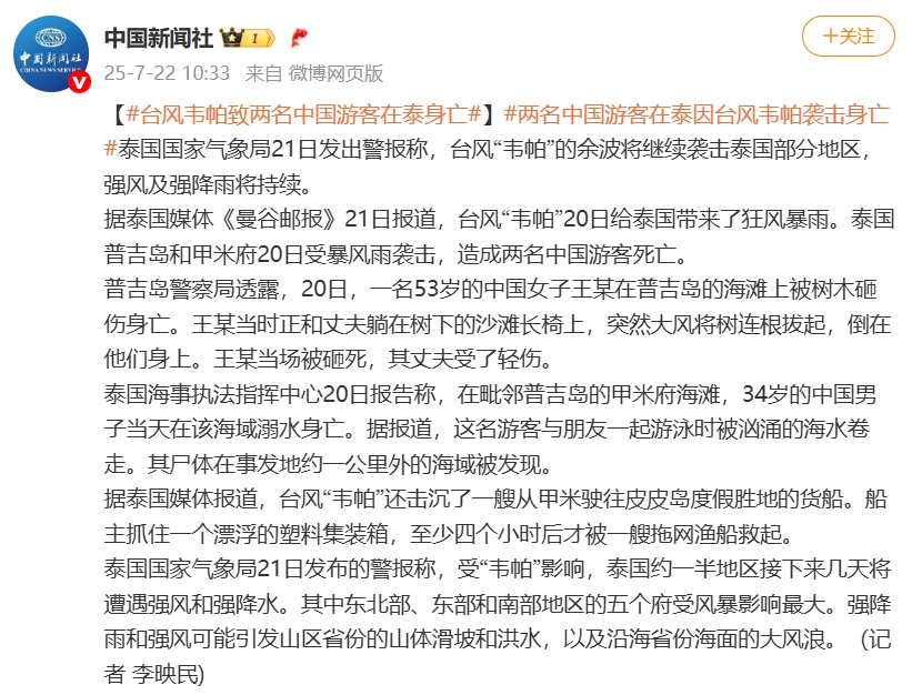 泰媒:台风“韦帕”致2名中国游客在泰身亡