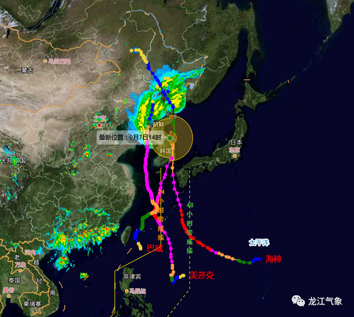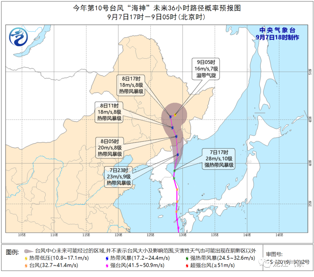 今年第10号台风“海神”已于7日下午减弱为强热带风暴级,下午5点钟其中心位于朝鲜东北部近海海面,就是北纬39.1度、东经128.7度,中心附近最大风力有10级(28米/秒),中心最低气压为975百帕,七级风圈半径300-350公里。8日上午移入黑龙江省境内,并逐渐变性为温带气旋。