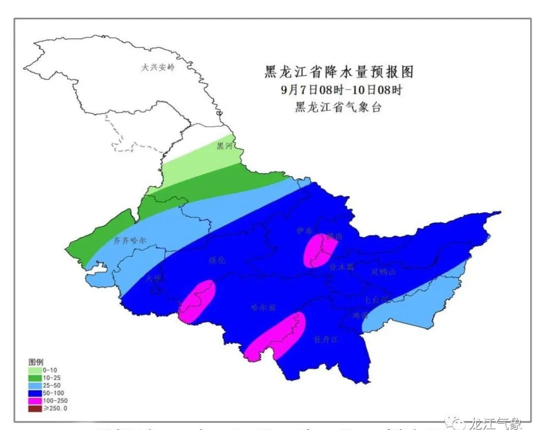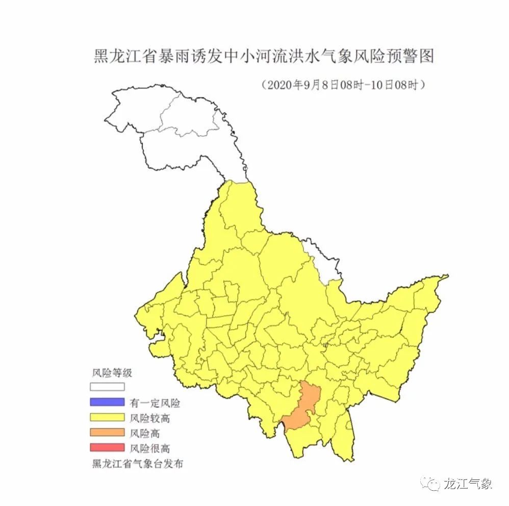 预计9月7日20时至10日08时,黑河东部、伊春、齐齐哈尔东北部、绥化、哈尔滨、鹤岗、佳木斯西部、双鸭山、七台河、鸡西西部、牡丹江降雨诱发山洪灾害气象风险较高。请上述地区加强防范,做好实时监测和转移避险等工作。