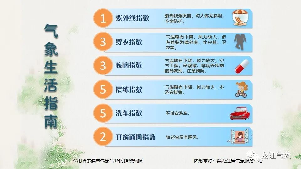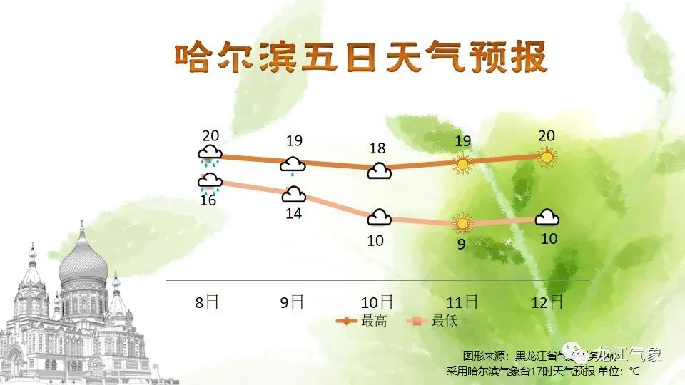 气温情况: 8日白天最高气温: 黑河、伊春、齐齐哈尔、绥化、大庆17~19℃,其它地区20~22℃。