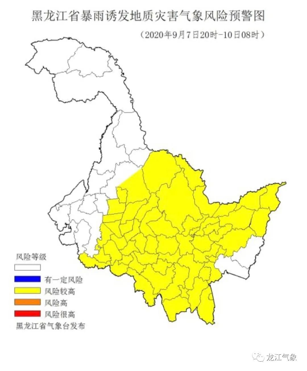 受持续降雨影响,预计9月7日20时至10日08时,黑河东部、伊春、齐齐哈尔东北部、绥化、大庆、哈尔滨、鹤岗、佳木斯、双鸭山、七台河、鸡西西部、牡丹江发生地质灾害气象风险较高。请上述地区注意局地短时强降水可能引发的崩塌、山体滑坡、泥石流等地质灾害,做好实时监测和转移避险等防范工作。