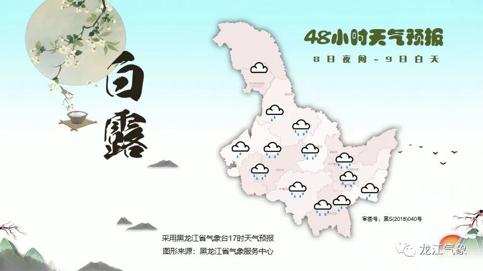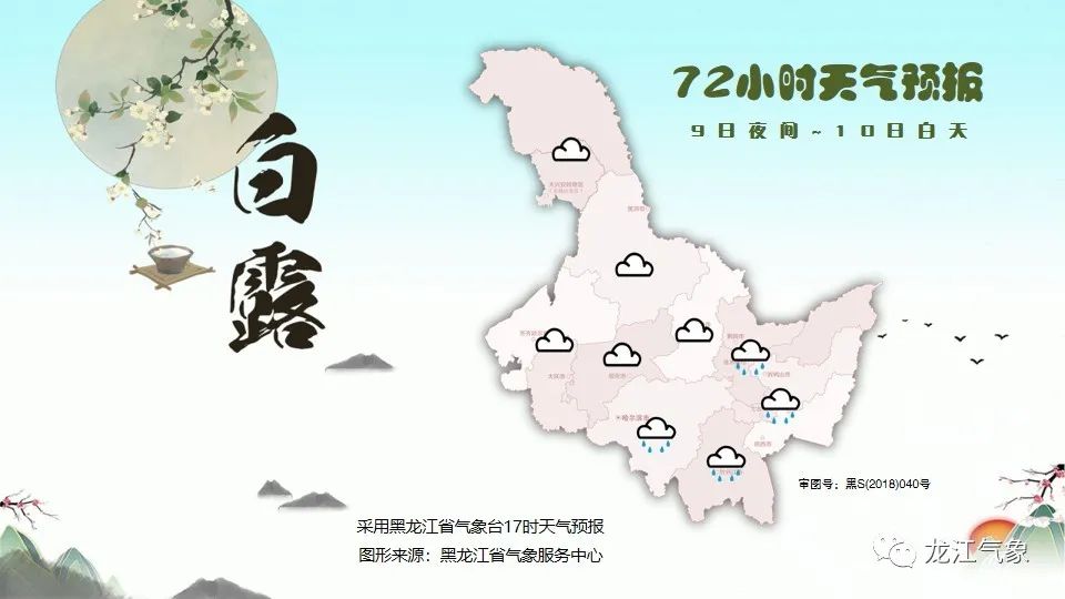 9日夜间到10日白天: 哈尔滨、鹤岗、佳木斯、双鸭山、七台河、鸡西、牡丹江阴有小到中雨,其它地区多云。