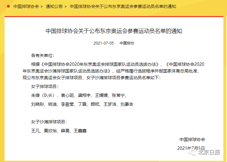 7月5日晚,中国排球协会公布东京奥运会女排项目和女子沙滩排球项目的参赛队员名单,其中女排大名单包括:朱婷(队长)、袁心玥、龚翔宇、王媛媛、张常宁、刘晓彤、姚迪、李盈莹、丁霞、颜妮、王梦洁、刘晏含。