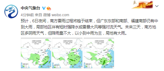 据@中央气象台:预计,6日夜间,南方雷雨过程将趋于结束,但广东东部和南部、福建南部仍有中到大雨,局部地区伴有短时强降水或雷暴大风等强对流天气。未来三天,南方地区多阴雨天气,但降雨量不大,以小到中雨为主,局地有大雨。