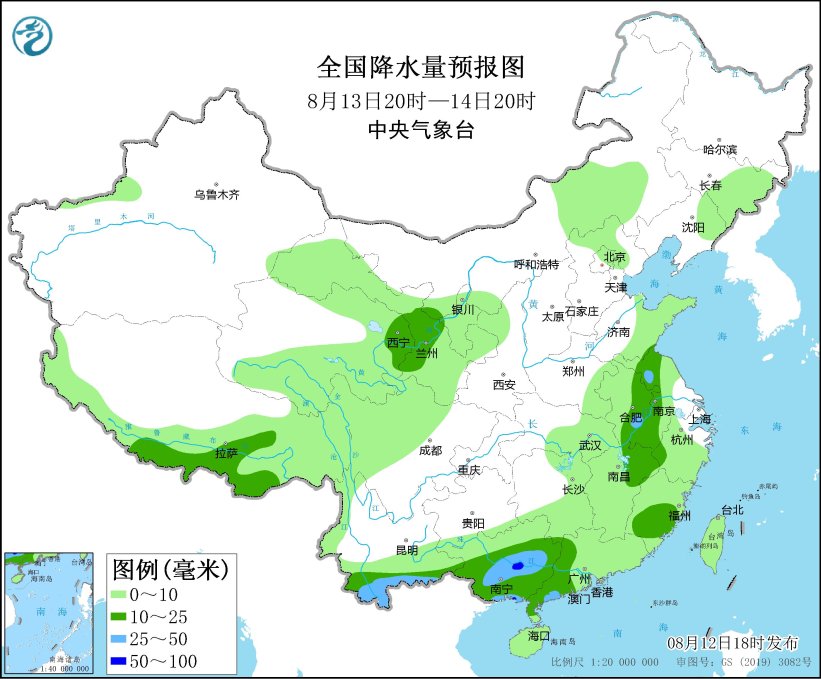 预计,8月12日20时至13日20时,江苏南部、安徽南部、浙江西部、福建西部、江西东部、湖南中南部、广东西南部、广西、云南南部以及内蒙古东南部、辽宁中北部、河北东部、天津东部等地的部分地区有大雨或暴雨,局地大暴雨(100~120毫米)(见图1),上述部分地区伴有短时强降水(最大小时降雨量20~50毫米,局地可超过80毫米);辽宁中北部、青海东部、山西中东部、北京东北部、安徽东南部、江苏南部、上海、湖南南部、浙江北部和西南部、福建北部和东南部、四川盆地东北部、广东西南部等地局地将有雷暴大风或冰雹天气。中央气象台8月12日18时继续发布暴雨蓝色预警。