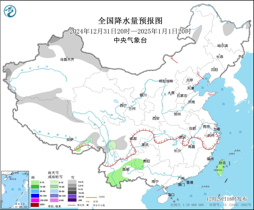 图3 全国降水量预报图(2024年12月31日20时-2025年1月1日20时)