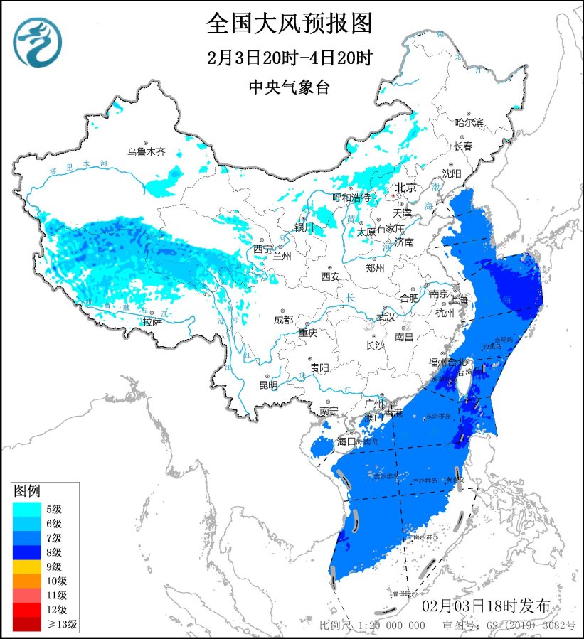2月3日夜间,冷空气将继续影响中东部地区,东北地区北部和东部、江淮、江南中东部、华南中东部等地气温下降4~6℃,部分地区下降8℃,北方地区伴有4~5级风,阵风7~8级。东部和南部海域有6~8级、阵风9~10级大风。中央气象台2月3日18时继续发布大风蓝色预警:预计,2月3日20时至4日20时,新疆东部、西藏中北部、青海南部、内蒙古中部、陕西北部、华北北部和西部等地有5~6级、阵风7~8级的大风,其中,其中西藏北部、青海南部部分地区风力可达6~8级、阵风9~10级。黄海大部海域、东海大部海域、台湾海峡、台湾以东洋面、巴士海峡、南海大部海域、北部湾将有7~8级、阵风9级的大风,其中台湾海峡、巴士海峡的部分海域风力可达9级、阵风10级(见图1)。