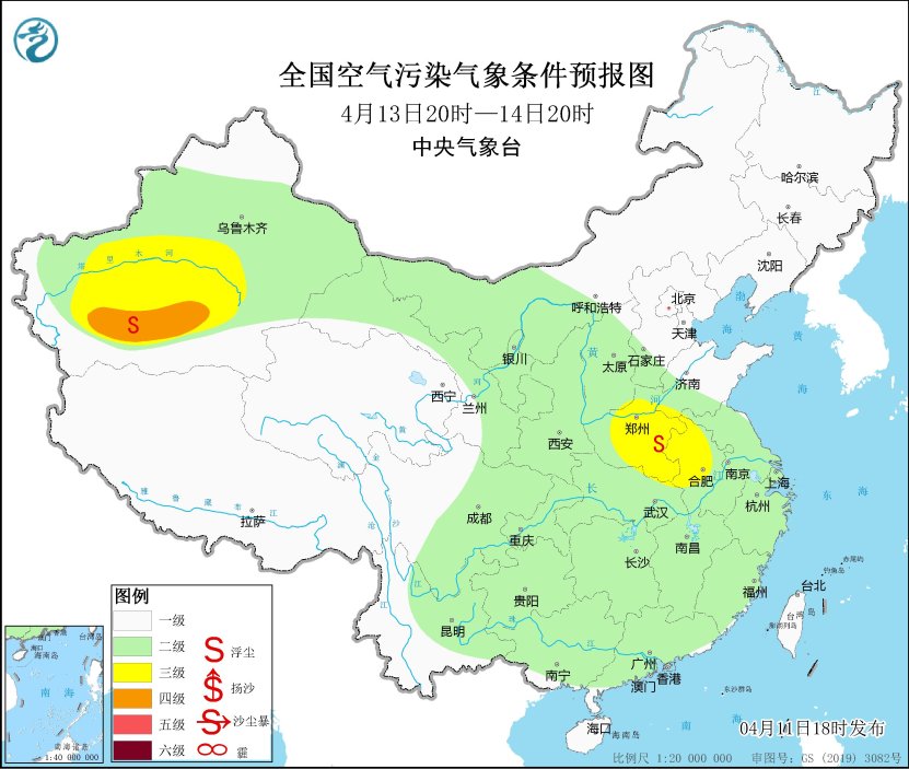 4月11日20时至12日20时,内蒙古西部、新疆南部、甘肃中东部、宁夏、陕西、山西、河北中南部、北京西部和南部、天津中南部、山东、河南、安徽中北部、江苏北部、湖北、湖南北部、四川盆地中北部、吉林西部等地的部分地区有扬沙或浮尘天气,其中,内蒙古西部、新疆南部、甘肃中部、宁夏等地的局部地区有沙尘暴。中央气象台4月11日18时继续发布沙尘暴蓝色预警。