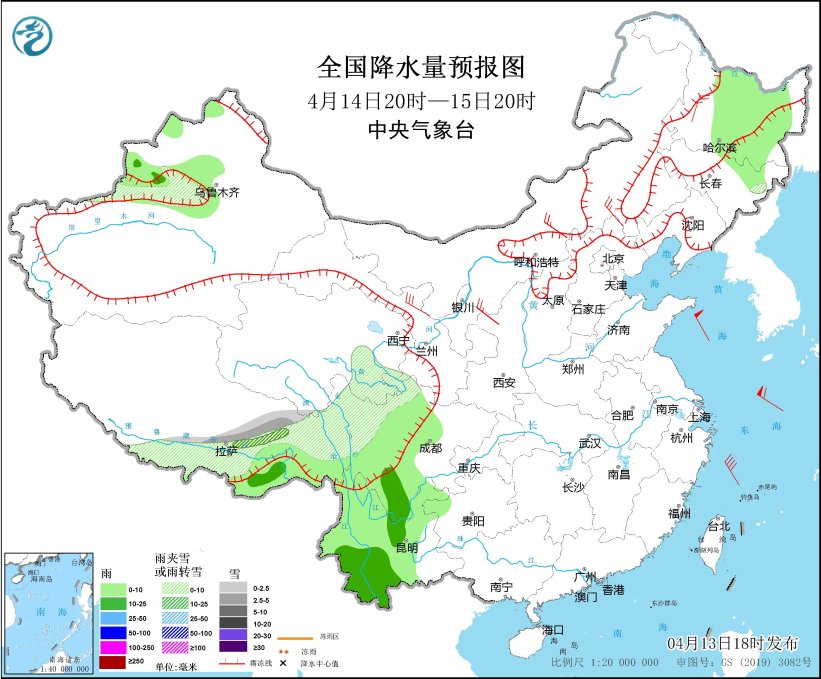 图4 全国降水量预报图(4月13日20时-14日20时)
