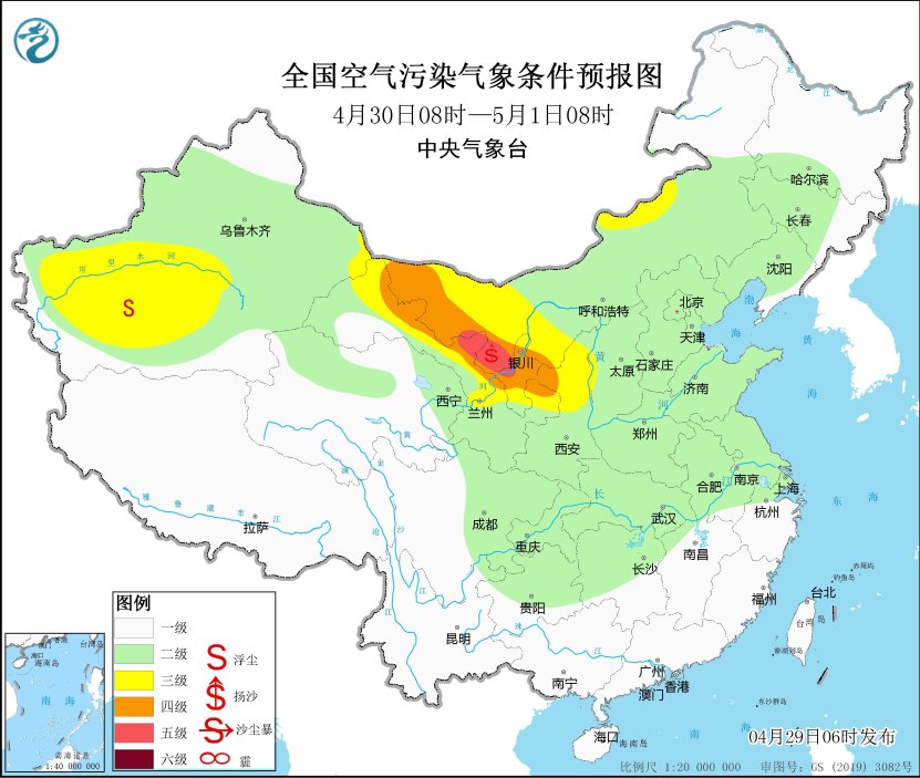 4月29日至5月1日,新疆东部、内蒙古西部、甘肃河西、宁夏中北部等地的部分地区有扬沙或浮尘天气。5月2日至3日,新疆东部和南部、内蒙古西部、甘肃河西等地的部分地区有扬沙或浮尘天气,局地有沙尘暴。此外,5月4日起,内蒙古中西部、西北地区东部等地的部分地区自西向东有沙尘天气。