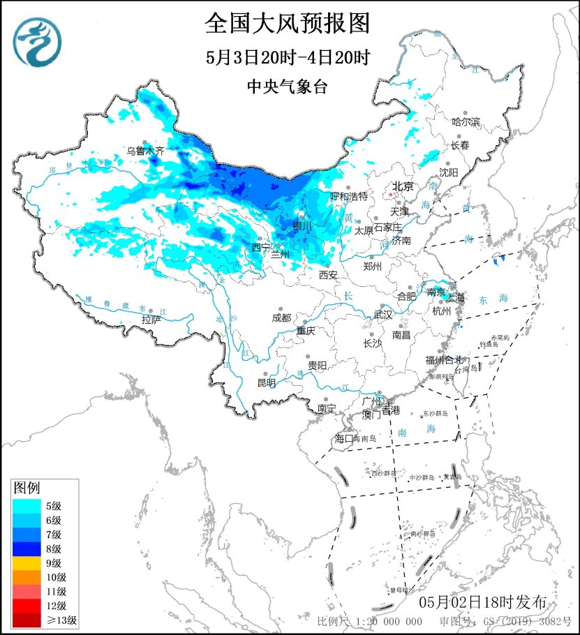 5月3日20时至4日20时,新疆东部、内蒙古中西部、青海大部、甘肃大部、宁夏、陕西北部等地有5~7级、阵风8~10级、局地11级的大风(见图2)。