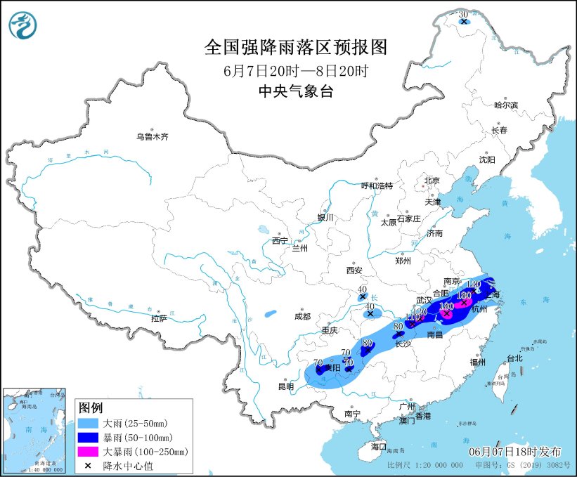 预计,6月7日20时至8日20时,江苏南部、安徽南部、上海、浙江北部和西部、江西北部、湖北东南部、湖南北部、贵州中南部、广西西北部等地部分地区有大到暴雨,其中,安徽南部、湖北东南部、江西北部、浙江西北部、湖南东北部等地部分地区有大暴雨(100~180毫米)。上述部分地区伴有短时强降水(最大小时降雨量20~50毫米,局地可超过80毫米),局地有雷暴大风等强对流天气。中央气象台6月7日18时继续发布暴雨黄色预警(见图1)。