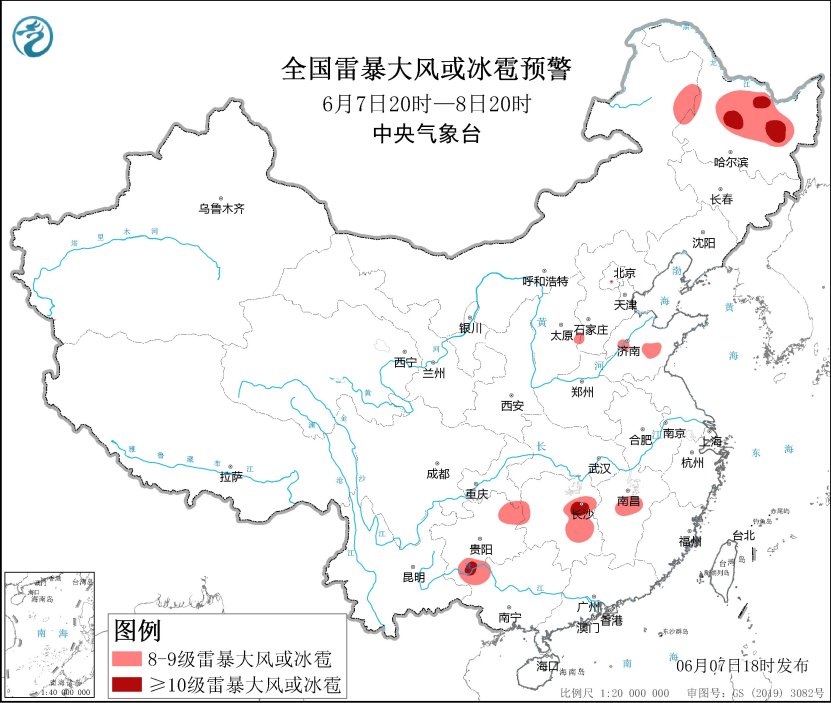 未来三天,东北地区、黄淮等地多阵雨或雷阵雨,局地伴有雷暴大风或冰雹等强对流天气。预计6月7日20时至8日20时,东北地区北部、黄淮、江南中部、西南地区东南部等地的部分地区将有8级以上雷暴大风或冰雹天气,其中,黑龙江中北部、湖南东部、贵州西南部等地的部分地区将有10级以上雷暴大风,最大风力可达11级以上。中央气象台6月7日18时继续发布强对流天气蓝色预警(见图2)。