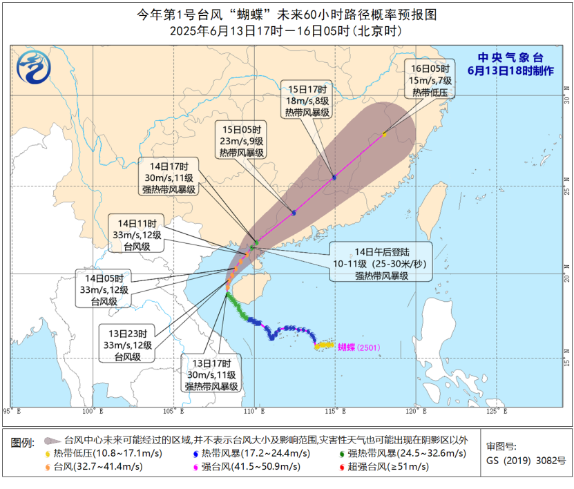预计,“蝴蝶”将以每小时15公里左右的速度向北偏东方向移动,将于14日午后在广东徐闻到广西北海一带沿海登陆(强热带风暴级,10~11级,25~30米/秒),登陆后转向东北方向快速移动,强度逐渐减弱。