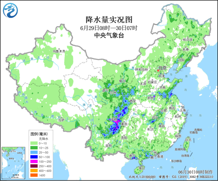 昨日,最强降雨出现在四川中东部,大部地区出现暴雨或大暴雨,四川宜宾和自贡局地特大暴雨(250~292毫米),上述地区最大小时降雨量达90~117毫米。预计今天,强降雨中心将位于四川东北部 、重庆北部、陕西南部等地,上述地区有暴雨或大暴雨(100~200毫米),局地并伴有短时强降水或雷暴大风等强对流天气。