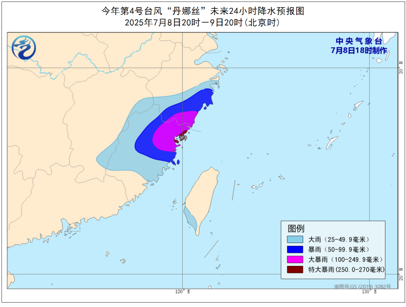 降水预报:7月8日20时至9日20时,浙江南部和东部、福建大部、江西东部和南部等地将有大到暴雨,其中,浙江东南部、福建东北部等地的部分地区有大暴雨,局地特大暴雨(250~270毫米)。