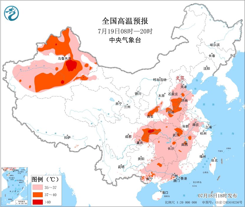 预计7月19日白天,新疆大部、陕西关中地区、山西西南部、河北南部、山东西部、河南大部、安徽大部、江苏西南部、湖北、湖南、江西、四川盆地东北部、重庆大部、广西中北部、广东中西部等地有35~36℃高温天气,其中,新疆准噶尔盆地和南疆盆地、陕西关中地区、河北南部、河南北部、湖北东部、重庆东北部和中部等地部分地区最高气温37~39℃,新疆吐鲁番盆地、重庆东北部局地可达40℃以上。
