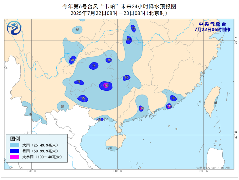 降水预报:7月22日08时至23日08时,海南岛南部、广东中南部、香港、澳门、福建东南部、台湾岛东部、广西大部、云南东部和南部、贵州、湖南中西部、湖北西部、重庆南部以及四川盆地中部和南部等地的部分地区有大到暴雨,其中,广东南部、广西北部、贵州南部等地的局部地区有大暴雨(100~140毫米)。