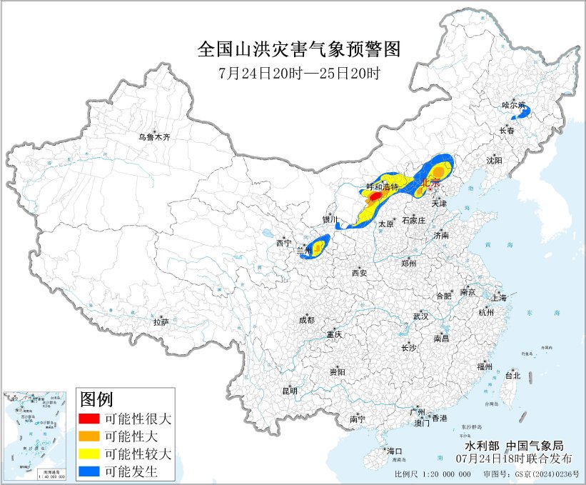 预计,7月24日20时至25日20时,北京西部、河北北部、内蒙古中部、甘肃东部等地部分地区发生山洪灾害可能性大(橙色预警),其中,内蒙古中部局地发生山洪灾害可能性很大(红色预警)。其他地区也可能因局地短历时强降水引发山洪灾害,请各地注意做好实时监测、防汛预警和转移避险等防范工作。