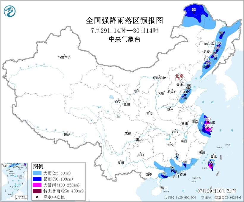 预计,7月29日14时至30日14时,内蒙古东北部、黑龙江西北部和中东部、吉林中东部、辽宁中东部、山东中北部、江苏中南部、上海、浙江中北部、福建东南部、广东、广西东部、台湾岛等地部分地区有大到暴雨,其中,黑龙江南部、吉林中部、辽宁中北部、江苏东南部、上海、浙江东北部、台湾岛南部等地部分地区有大暴雨,局地特大暴雨(250~300毫米)。上述部分地区伴有短时强降水(最大小时降雨量20~50毫米,局地可超过80毫米),局地有雷暴大风等强对流天气。