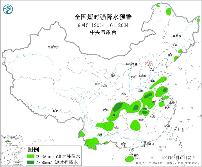 预计9月5日20时至6日20时,内蒙古东部、西南地区东部、江汉西部和南部、黄淮南部、江淮西部、江南中部等地的部分地区将有8级以上雷暴大风或冰雹天气,其中,四川东部、重庆南部、贵州西部等地的部分地区将有10级以上雷暴大风;东北地区北部和东部、黄淮中东部、江汉、江淮、江南中西部、西南地区东部和南部等地的部分地区将有小时雨量大于20毫米的短时强降水天气,其中,河南东南部、安徽北部、江苏北部、湖北南部、四川东北部、重庆西部等地的部分地区小时雨量大于50毫米,最大可达80毫米以上。