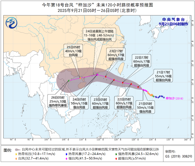 预计,“桦加沙”将以每小时15公里的速度继续向西北方向移动,强度继续增强。22日将穿过巴士海峡,23日凌晨进入南海东北部海面,以后趋向广东沿海。