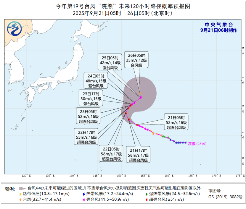 今年第19号台风“浣熊”已于今天(21日)早晨加强为超强台风级,早晨5点钟其中心位于距离日本东京东偏南方向约1600公里的西北太平洋洋面上,就是北纬27.0度、东经153.2度,中心附近最大风力有16级(52米/秒),中心最低气压为935百帕,七级风圈半径180-250公里,十级风圈半径140公里,十二级风圈半径90-100公里。
