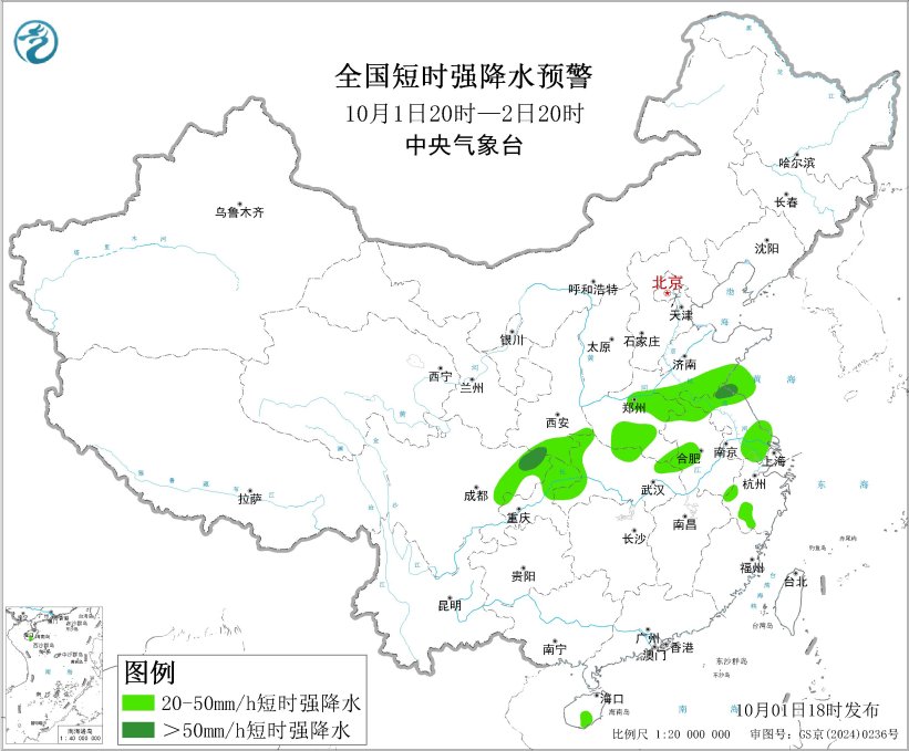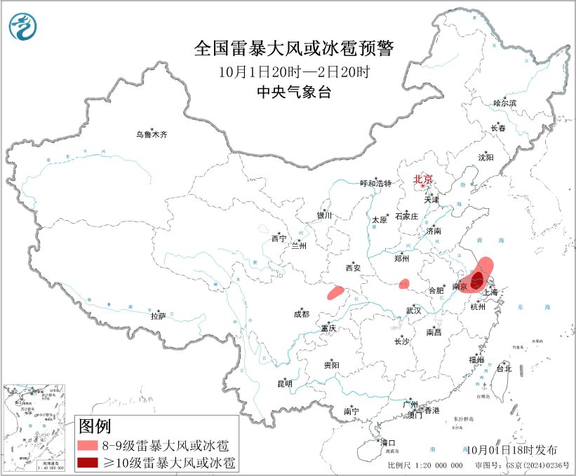 预计10月1日20时至2日20时,江淮东部、江汉东部、西南地区东部等地的部分地区将有8级以上雷暴大风或冰雹天气,其中,江苏中南部部分地区将有10级以上雷暴大风,最大风力可达11级以上;黄淮南部、江淮东南部、江汉北部、西南地区东部等地的部分地区将有小时雨量大于20毫米的短时强降水天气,其中,江苏北部、四川东北部等地的部分地区小时雨量大于50毫米,最大可达60毫米以上。