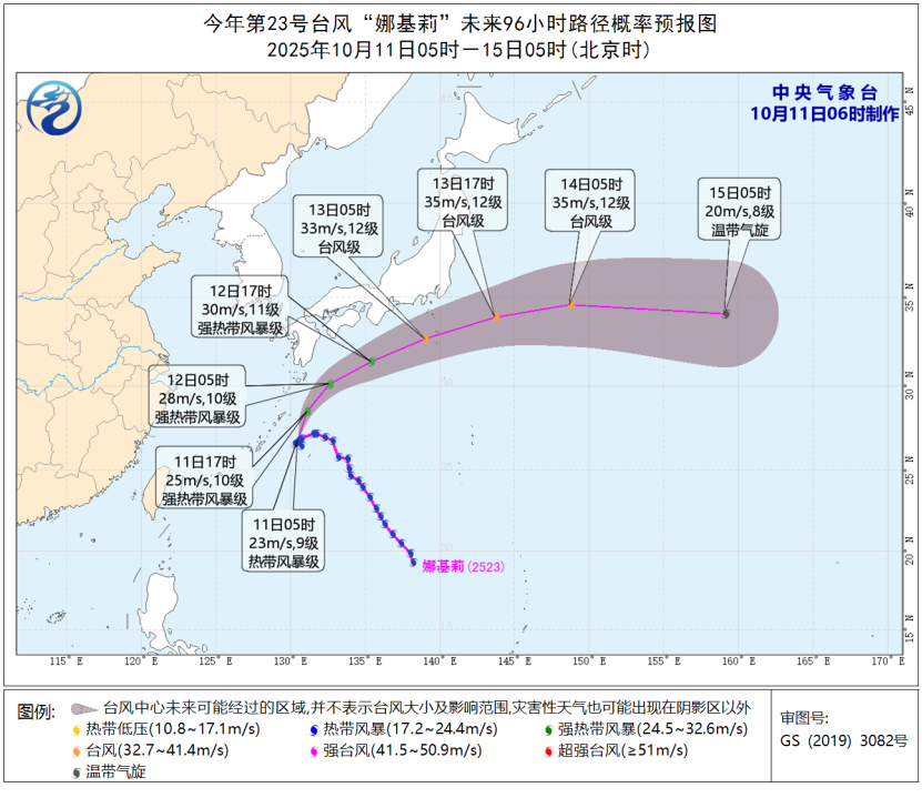 预计,“娜基莉”将以每小时15-20公里的速度向北偏东方向移动,向日本以南洋面靠近,强度缓慢加强。受其影响,11日白天至夜间,东海东部偏东的部分海域有6-8级大风,阵风9-11级。